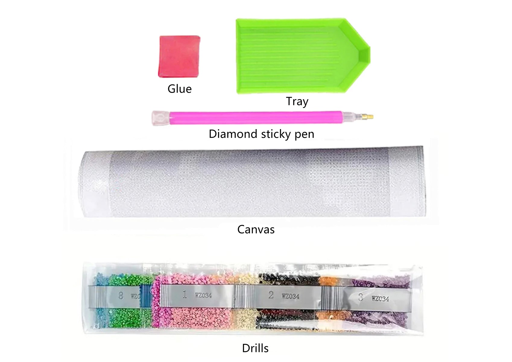 Every kit includes your custom printed canvas, pre-sorted diamonds (with 20% extra), pen, tray, wax, and instructions.